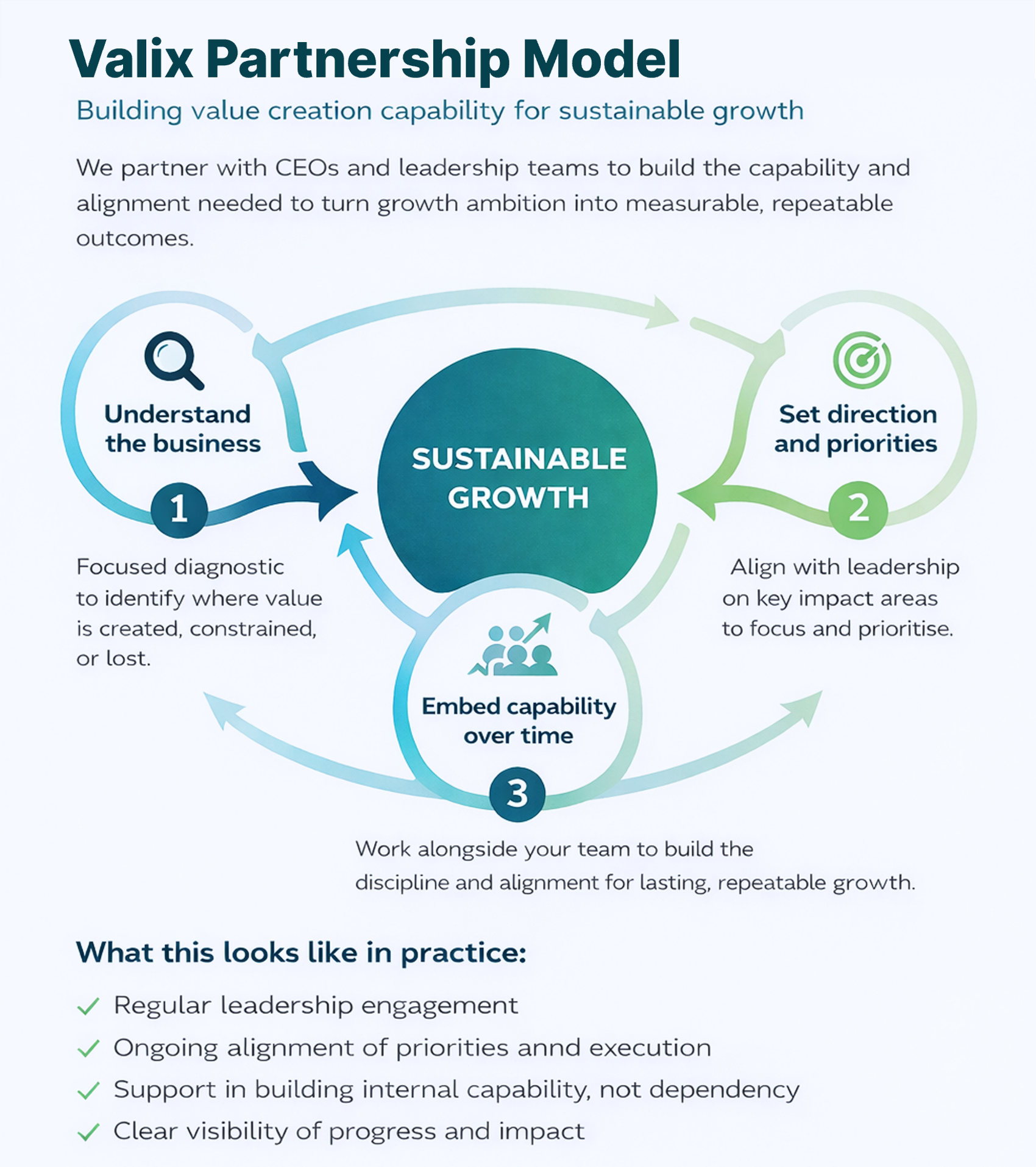 valix partners with CEO's and leadership teams to build value creation capability, so growth becomes consistent, measurable, and repeatable